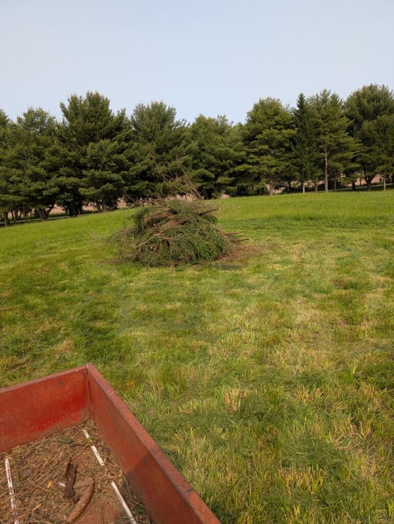 We started by mowing the path and piling trimmings from the conifers lining the driveway in the areas planned for spring trees. The trimmings seasoned over the fall and winter, and then Chris burned the piles a few at a time.